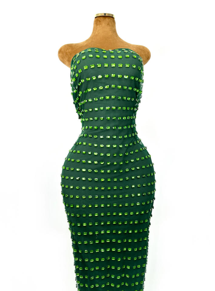 Precision Embellishment: Features thousands of uniform, square-cut resin crystals arranged in a perfect geometric grid for a modern, architectural feel.