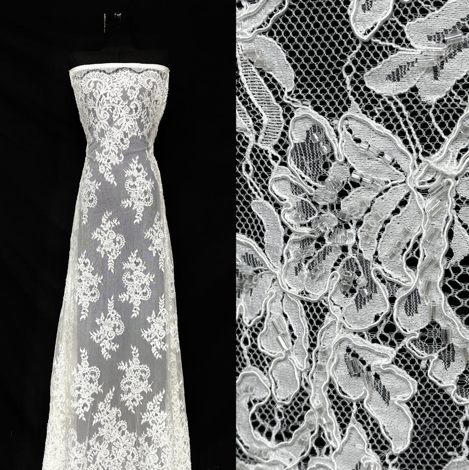 A masterpiece of textile artistry, this exquisite lace fabric is designed for high-end bridal couture and luxury evening wear. It seamlessly blends traditional embroidery with intricate beading for a breathtaking visual experience.