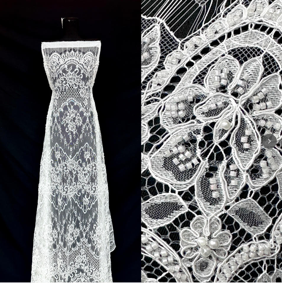 A masterpiece of textile artistry, this exquisite lace fabric is designed for high-end bridal couture and luxury evening wear. It seamlessly blends traditional embroidery with intricate beading for a breathtaking visual experience.