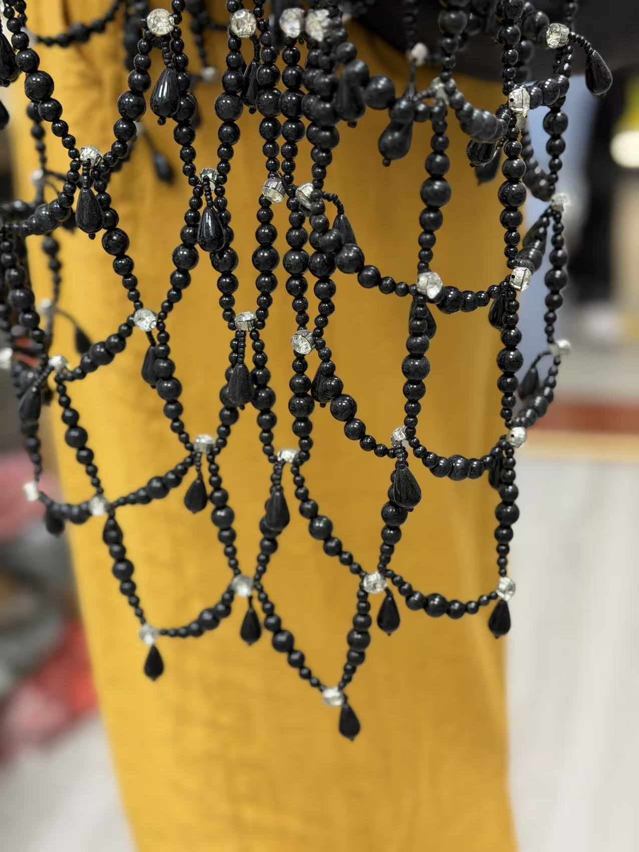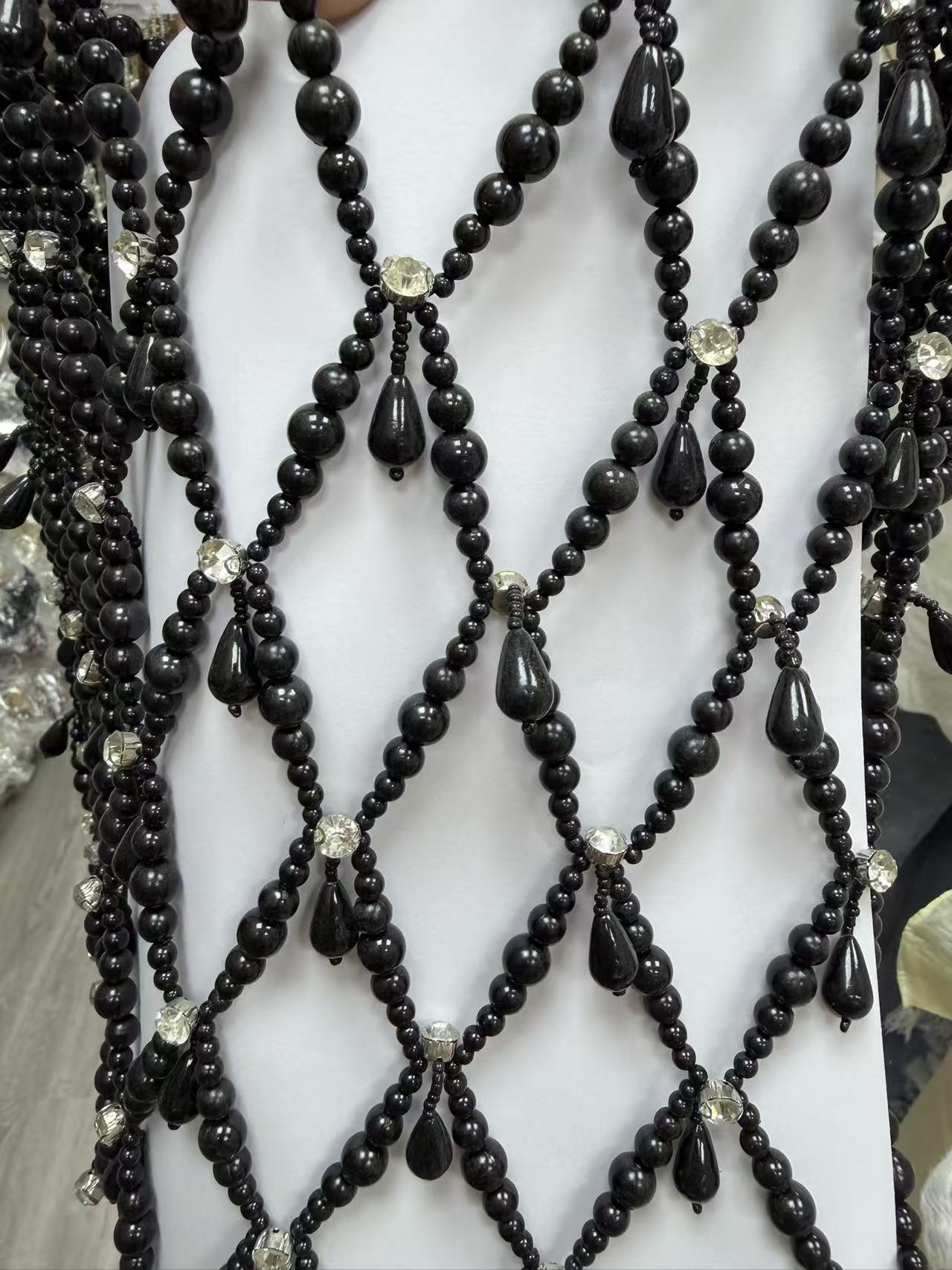 Materials: Crafted with high-luster black pearls and brilliant crystals. The teardrop pearl pendants add depth and dynamic movement to the visual aesthetic.