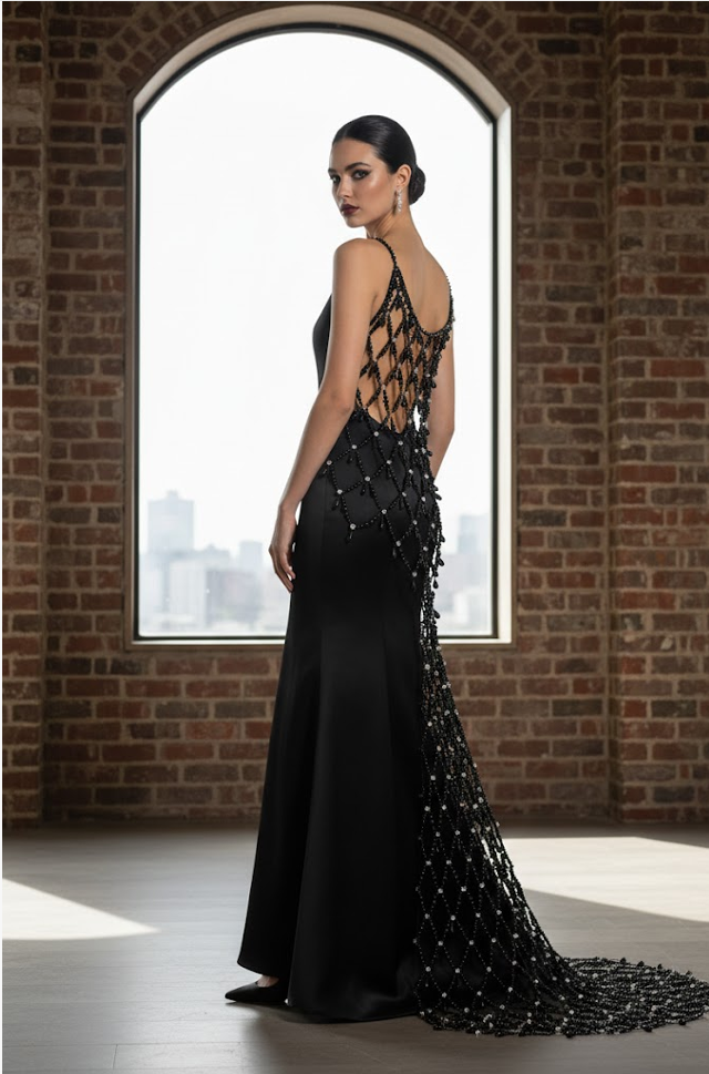Design Tips: Recommended for shoulder or back detailing, or as a full fringed overlay that shimmers and flows with every step.