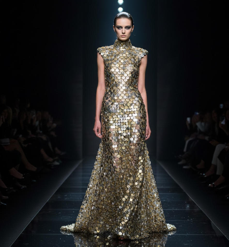 Material Characteristics: The two-tone design and densely arranged circular discs provide the fabric with an excellent drape, capturing light with every movement to create a highly dimensional, sculptural aesthetic.